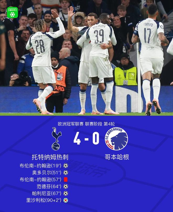 北京时间11月5日欧洲冠军联赛 联赛阶段 第4轮,托特纳姆热刺对阵哥本哈根。托特纳姆热刺布伦南-约翰逊破门,奥多贝尔破门,范德芬破门,帕利尼亚破门。最终比分热刺 4-0 哥本哈根。